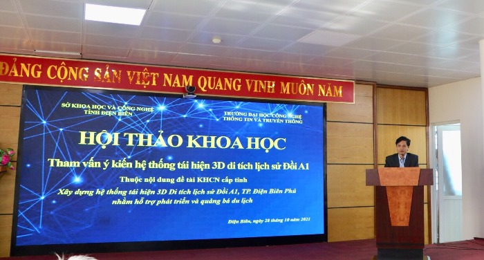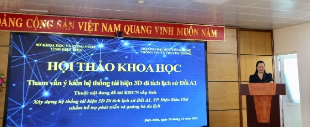 Phát biểu tại buổi Hội thảo, đồng chí Vũ Đức Thái giới thiệu về nội dung đề tài khoa học công nghệ “Xây dựng hệ thống tái hiện 3D Di tích lịch sử Đồi A1, thành phố Điện Biên Phủ nhằm hỗ trợ phát triển và quảng bá du lịch” với sự phát huy công nghệ mới nhất hiện nay, thành viên đề tài đã tích cực tham gia thực hiện đề tài và trình bày kết quả tại hội thảo.