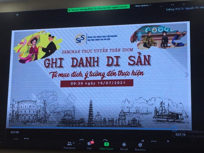 Tại buổi tọa đàm, diễn giả - PGS.TS Nguyễn Thị Hiền giảng viên Khoa Các Khoa học liên ngành, Đại học Quốc gia Hà Nội đã làm rõ các hình thức ghi danh di sản, mục đích của sự ghi danh và khám phá những cách hiểu khác nhau về ghi danh di sản. Tham gia buổi tọa đàm trực tuyến đã giúp cho công chức, viên chức đang thực hiện nhiệm vụ chuyên môn về lĩnh vực Di sản văn hoá Sở Văn hóa, Thể thao và Du lịch tỉnh Điện Biên hiểu rõ hơn về các các hình thức ghi danh di sản, đồng thời còn tạo ra một diễn đàn cho các chuyên gia, nhà quản lý trong lĩnh vực di sản chia sẻ về quan điểm và trao đổi kinh nghiệm về những vấn đề liên quan đến ghi danh di sản trong thực tế.