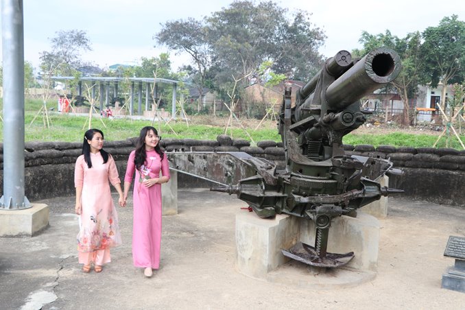 Nữ đoàn viên công đoàn chụp ảnh lưu niệm với du khách tại di tích đồi A1