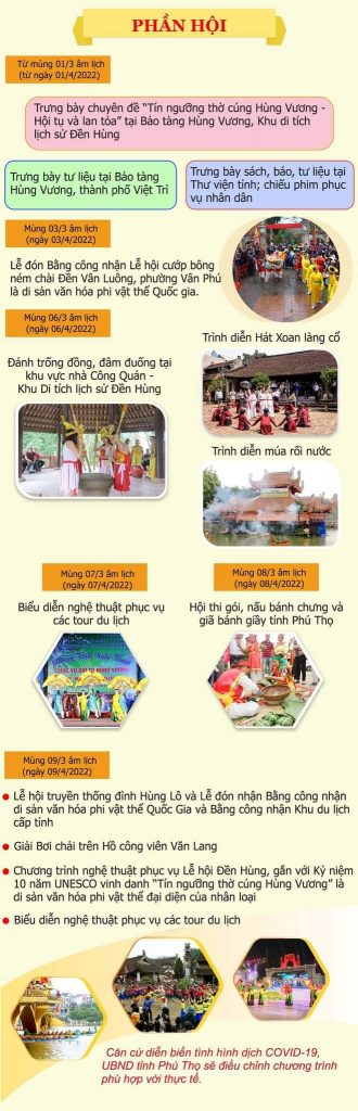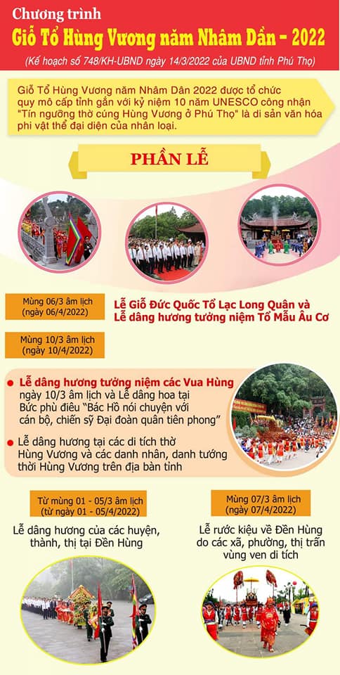 Chương trình Giỗ tổ Hùng Vương năm Nhâm Dần 2022 được tổ chức quy mô cấp tỉnh gắn với kỷ niệm 10 năm UNESCO công nhận "Tín ngưỡng thờ cúng Hùng Vương ở Phú Thọ" là di sản văn hóa phi vật thể đại diện của nhân loại, gồm hai phần: Phần lễ và Phần hội với nhiều hoạt động văn hóa, tín ngưỡng đặc sắc, sôi động và hấp dẫn.