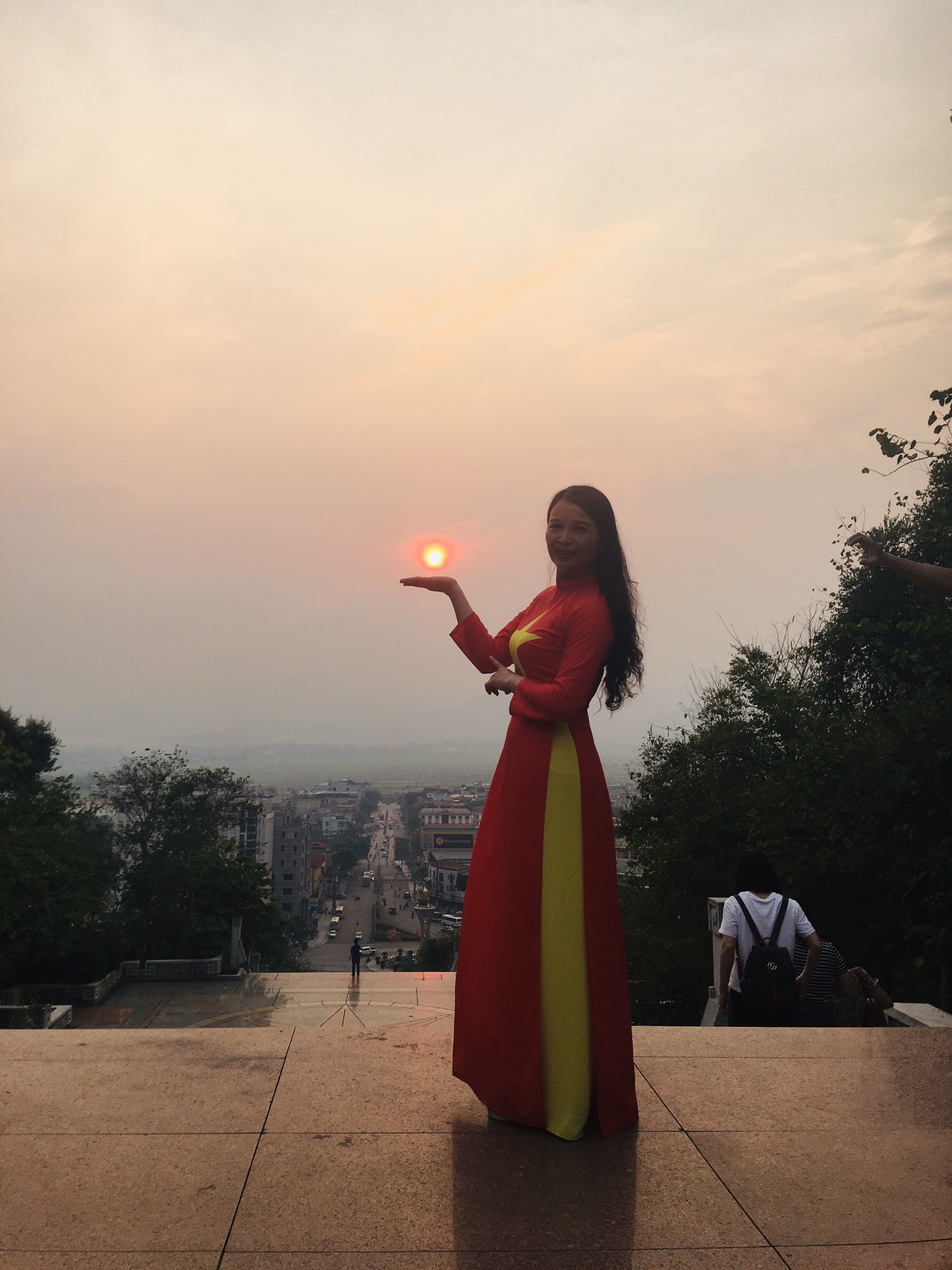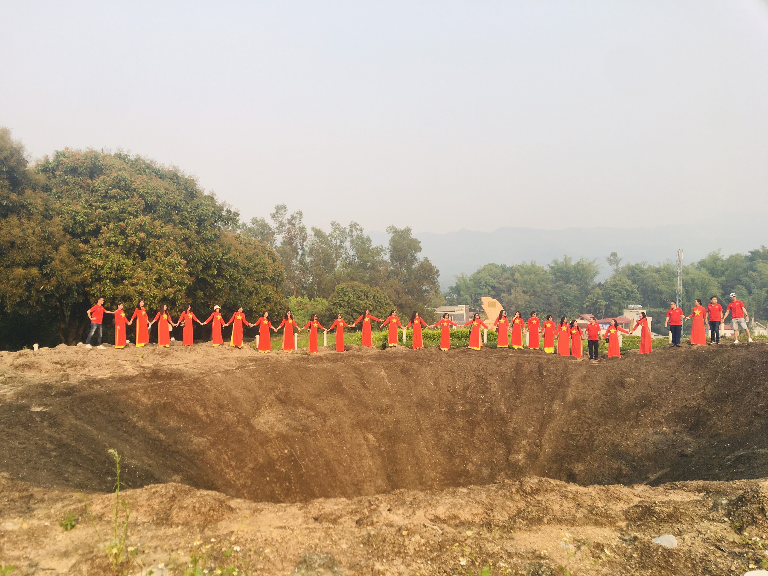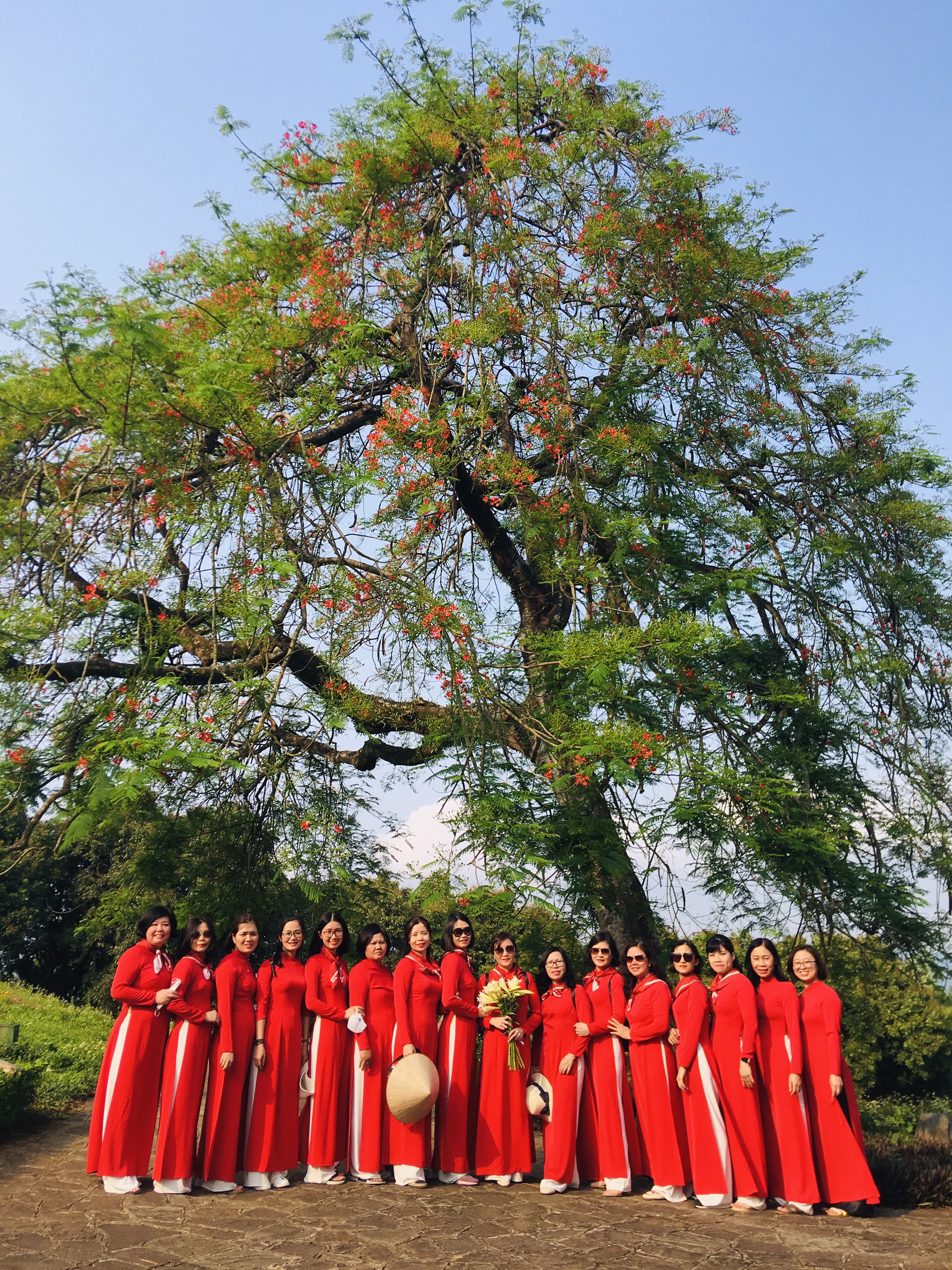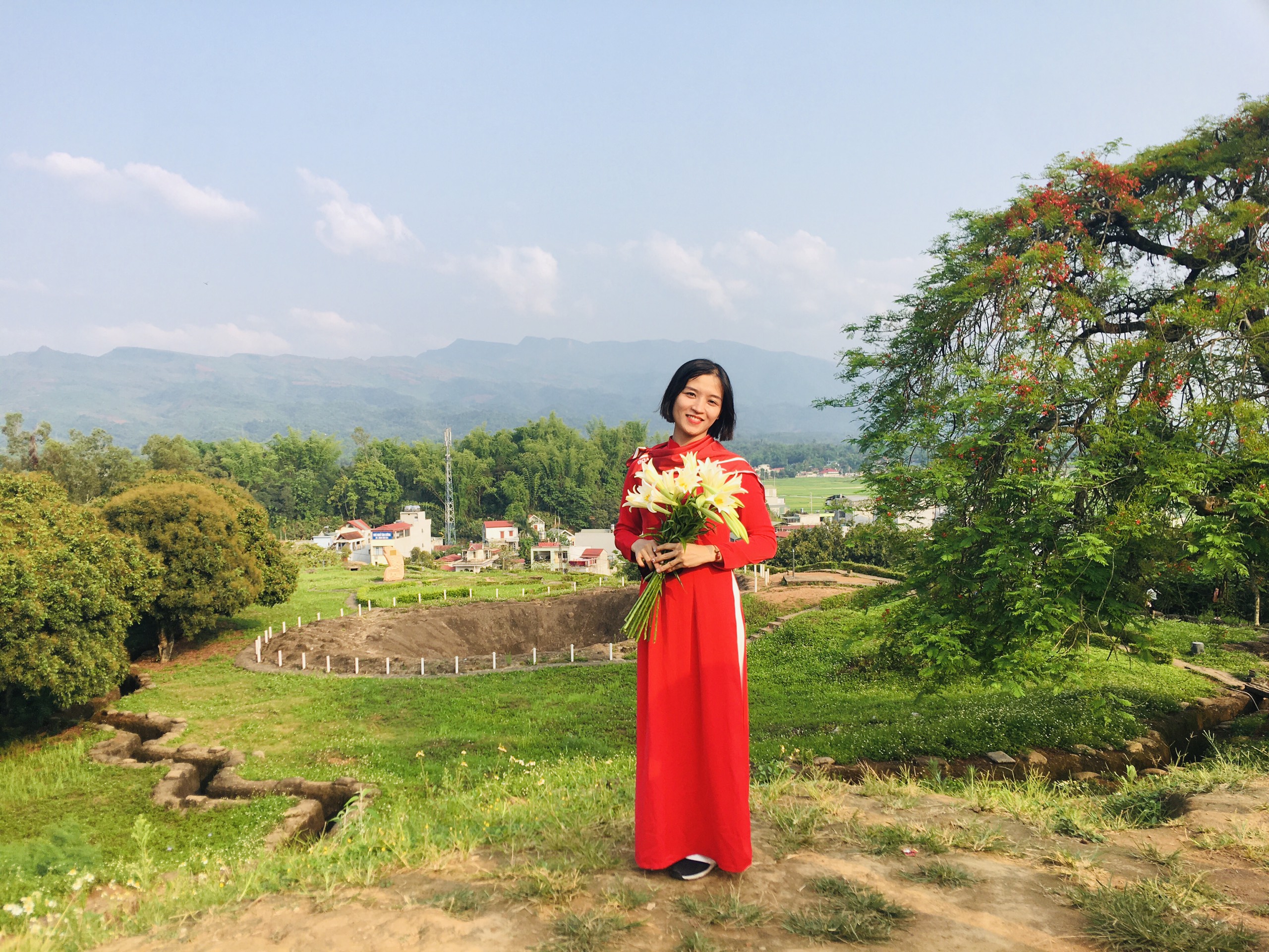Các chị em mặc áo dài chụp ảnh tại di tích đồi A1