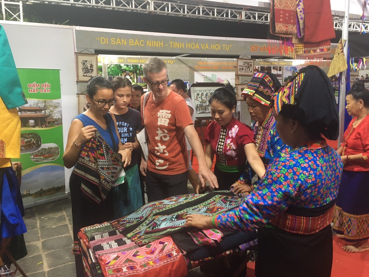 Du khách nước ngoài tham quan và tìm hiểu về sản phẩm trưng bày tại gian hàng triển lãm