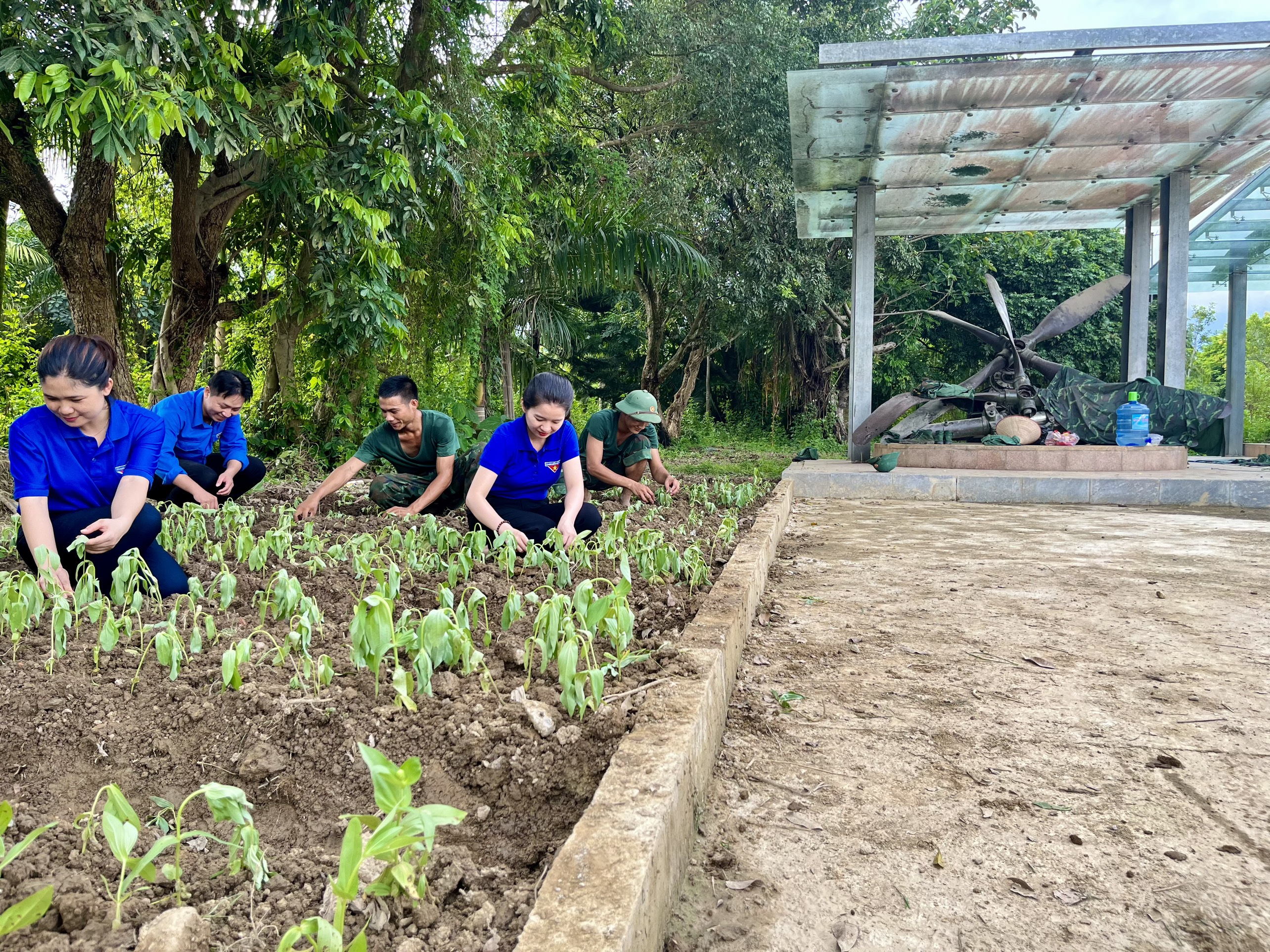 Đoàn viên Chi đoàn trồng hoa tại di tích Trung tâm Tập đoàn cứ điểm Điện Biên Phủ