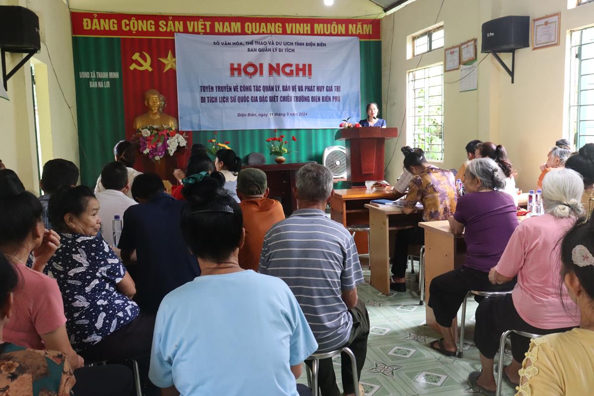 Thực hiện Kế hoạch số 309/KH-BQLDT ngày 15 tháng 8 năm 2024 của Ban Quản lý di tích tỉnh Điện Biên về việc tổ chức Hội nghị tuyên truyền về công tác quản lý, bảo vệ và phát huy giá trị di tích lịch sử Quốc gia đặc biệt Chiến trường Điện Biên Phủ tại địa bàn dân cư, năm 2024. Ngày 11/9/2024, Ban Quản lý di tích đã tổ chức tuyên truyền tới các hộ gia đình có đất giáp ranh và liền kề với đất Di tích Trận địa pháo H6 của Tiểu đoàn 224, Trung đoàn 675, Đại đoàn 351 tại Nhà Văn hoá bản Nà Lơi, xã Thanh Minh, thành phố Điện Biên Phủ.