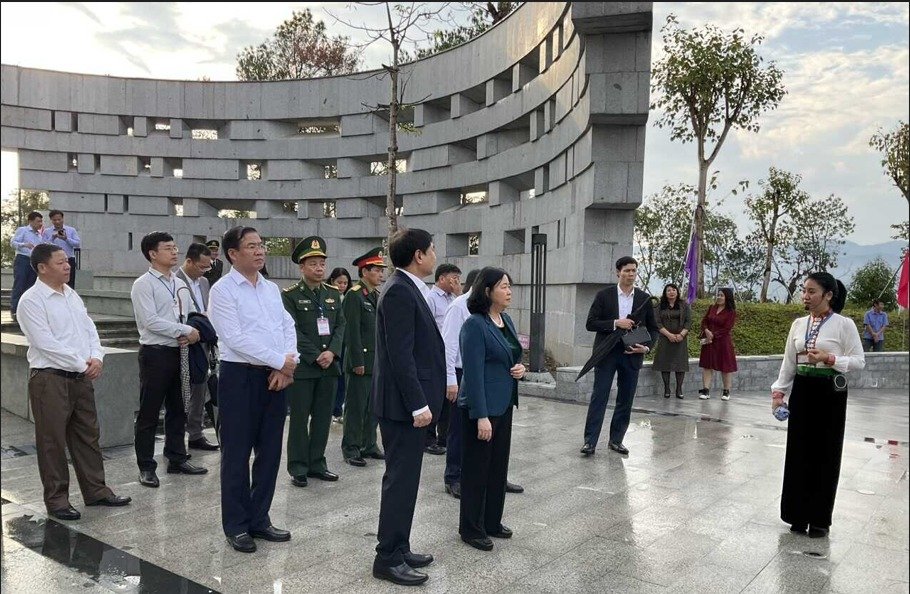 Đồng chí Bùi Thị Minh Hoài cùng đoàn công tác nghe hướng dẫn viên của Ban quản lý di tích giới thiệu về di tích đồi F và công trình đền thờ liệt sĩ