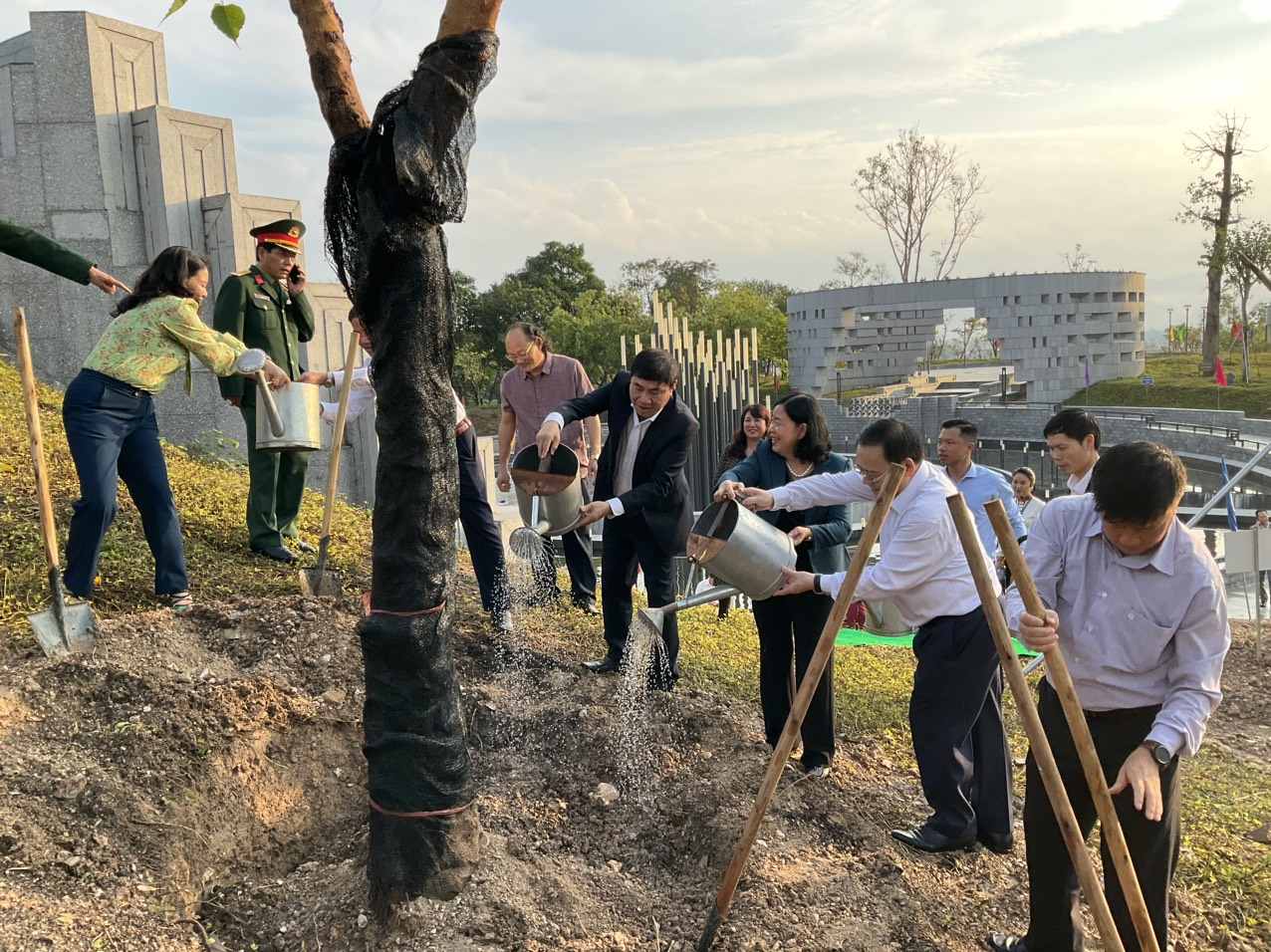 Sau khi dâng hương tri ân các anh hùng liệt sỹ, Đồng chí Bùi Thị Minh Hoài, Bí thư Trung ương Đảng, Trưởng Ban Dân vận Trung ương cùng đoàn công tác trồng cây lưu niệm tại đền thờ liệt sĩ tại Chiến trường Điện Biên Phủ./.