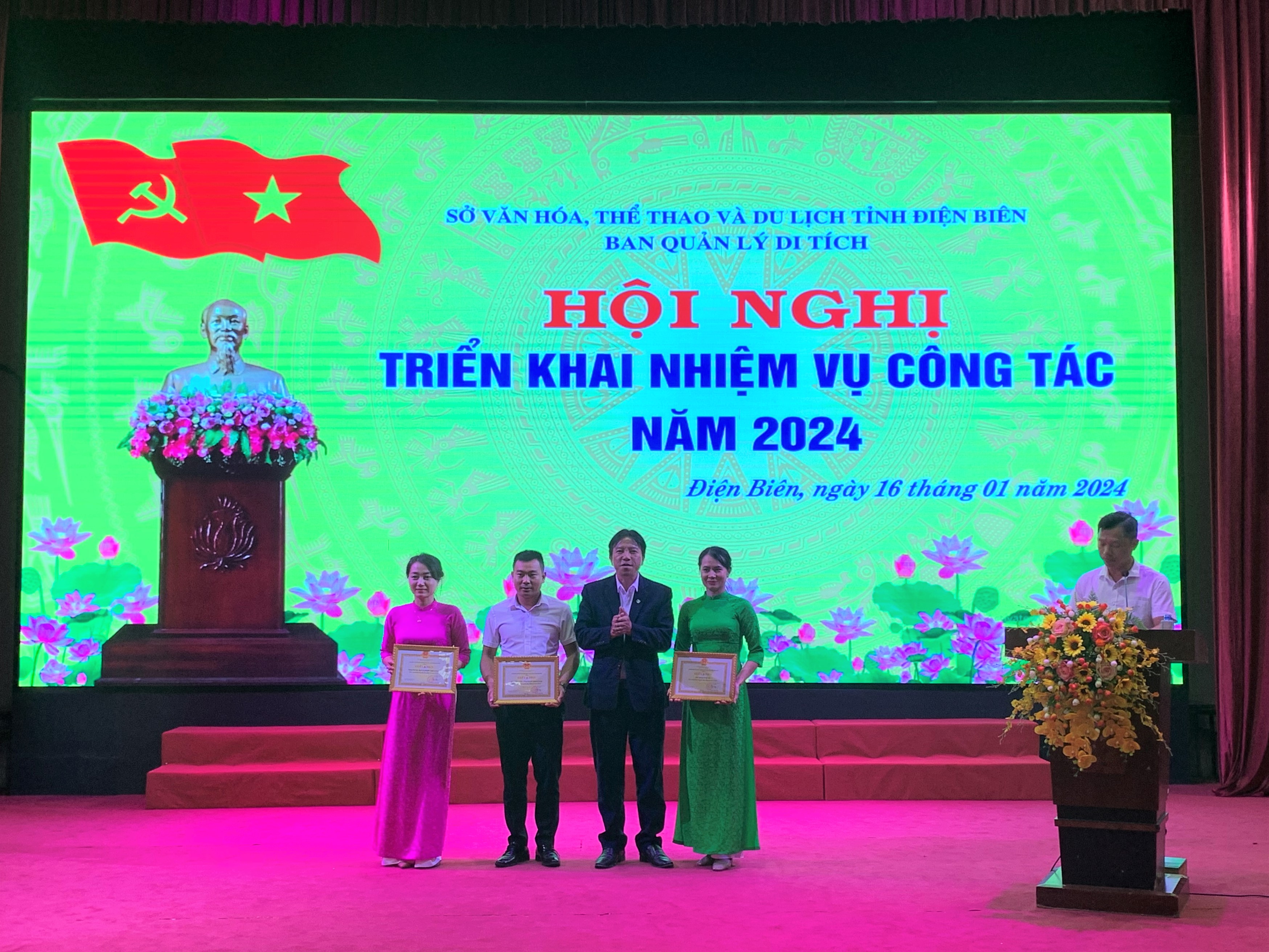 Đến dự và chỉ đạo Hội nghị có đồng chí Nguyễn Hoàng Hiệp - Uỷ viên Ban Thường vụ Đảng uỷ, Phó Giám đốc Sở Văn hóa, Thể thao và Du lịch; các đồng chí lãnh đạo các phòng chuyên môn, đơn vị sự nghiệp thuộc Sở Văn hóa, Thể thao và Du lịch; Lãnh đạo Phòng An ninh đối ngoại - Công an tỉnh; một số đơn vị phối hợp với đơn vị trong công tác bảo vệ và phát huy giá trị di tích trên địa bàn tình cùng toàn thể viên chức, người lao động Ban Quản lý di tích. Trong năm 2023, dưới sự lãnh đạo, chỉ đạo của Đảng ủy, Ban Gám đốc Sở Văn hóa, Thể thao và Du lịch, Ban Quản lý di tích đã hoàn thành và hoàn thành vượt mức các chỉ tiêu, nhiệm vụ công tác được giao. Hội nghị đã trình bày, thảo luận và thông qua Báo cáo đánh giá kết quả thực hiện nhiệm vụ công tác năm 2023; Triển khai các chỉ tiêu Kế hoạch giao phát triển sự nghiệp văn hóa, thể thao và du lịch năm 2024 và Chương trình giải pháp chỉ đạo, điều hành thực hiện chỉ tiêu, kế hoạch sự nghiệp văn hóa, thể thao và du lịch năm 2024. Phát biểu chỉ đạo, đồng chí Nguyễn Hoàng Hiệp - Uỷ viên Ban Thường vụ Đảng uỷ, Phó Giám đốc Sở Văn hóa, Thể thao và Du lịch đã biểu dương, ghi nhận những kết quả đã đạt được của Ban Quản lý di tích; đồng thời, chỉ ra những khó khăn, tồn tại hạn chế cần khắc phục. Với mục tiêu, nhiệm vụ và giải pháp năm 2024, đồng chí Phó Giám đốc Sở đề nghị Ban Quản lý di tích xây dựng chương trình cụ thể, đặc biệt quan tâm một số nhiệm vụ cấp bách trong công tác bảo tồn, tôn tạo và phát huy giá trị Di tích lịch sử Quốc gia đặc biệt Chiến trường Điện Biên Phủ, công tác cải tạo cảnh quan và các điều kiện cần thiết để chuẩn bị phục vụ khách tham quan du lịch vào dịp lễ Kỷ niệm 70 năm Chiến thắng Điện Biên Phủ, lễ hội Hoa Ban, Năm du lịch Quốc gia Điện Biên 2024. Tại Hội nghị, Ban Quản lý di tích đã vinh dự được nhận giấy khen của Giám đốc Công an tỉnh Điện Biên về việc góp phần gìn giữ an ninh Tổ quốc năm 2023. Với những thành tích đã đạt được trong năm 2023, Ban Quản lý di tích có 03 tập thể, 05 cá nhân đạt danh hiệu Chiến sĩ thi đua cấp cơ sở, 24 cá nhân có thành tích xuất sắc trong năm 2023 đã vinh dự nhận được giấy khen của giám đốc Sở Văn hóa, Thể thao và Du lịch.