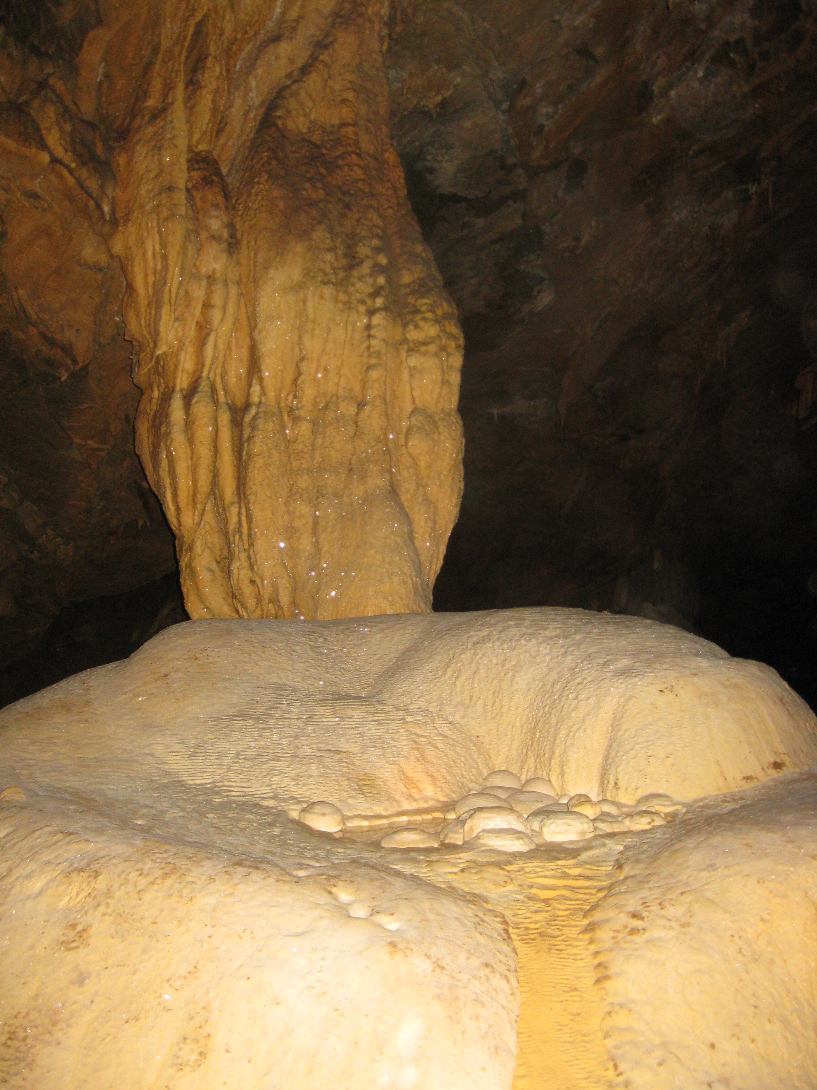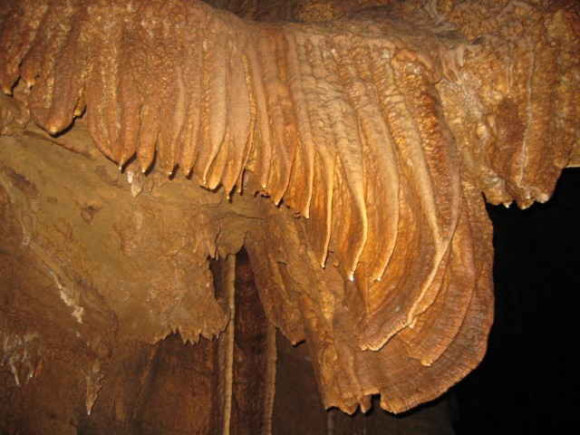 Vách hang động là các gườm đá dài như dải lụa trải dài, những thác nước màu vàng bằng đá mang như đang tuôn trào đổ nước xuống nền hang, một số nhũ đá có đường viền sắc nhọn lúc thì mềm mại uyển chuyển như những dải san hô dưới biển, lúc thì mang dáng cứng cáp với vô số hạt kết tinh sáng lấp lánh; một số nhũ đá mọc nối tiếp nhau như những cây xương rồng mọc giữa sa mạc, một số thì mang hình dáng những cây măng, cây nấm khổng lồ vững chắc với bộ rễ dài đâm sâu xuống, ở các đầu nhũ chứa những giọt nước li ti tinh khiết nhỏ xuống nền hang động, làm cho cả khoang trở nên mát lạnh.