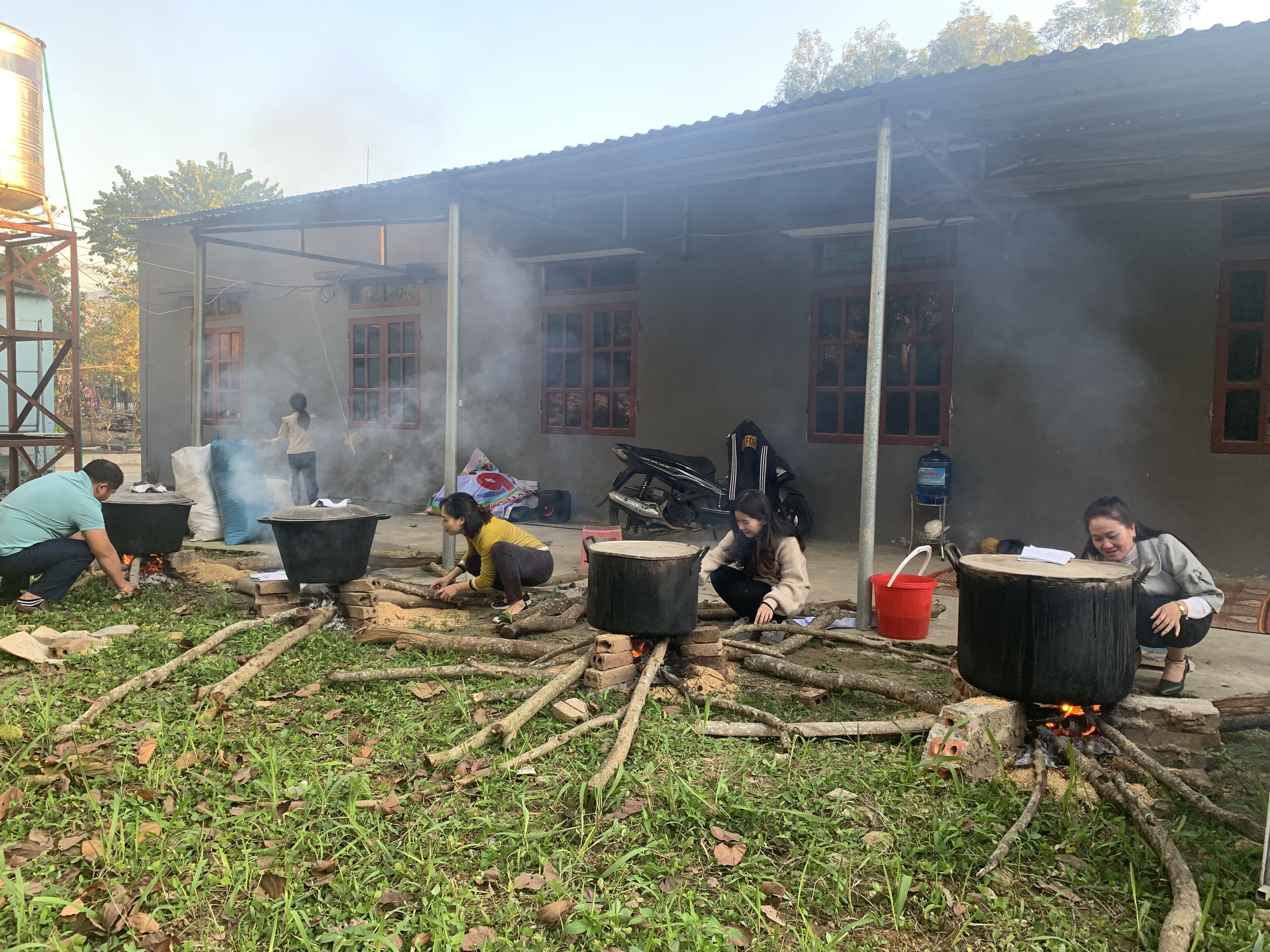 Các đoàn viên đang luộc bánh chưng