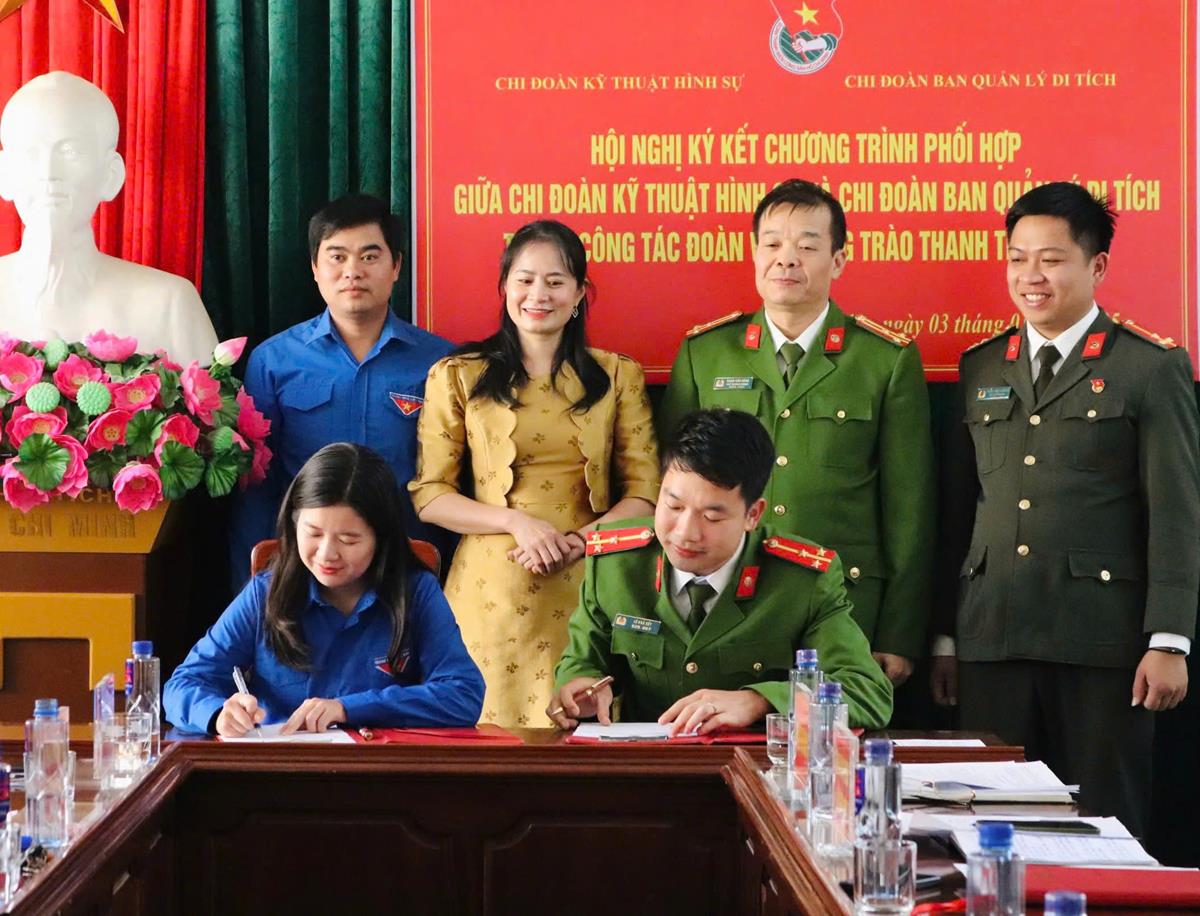 Với mục đích xây dựng mối quan hệ phối hợp trong công tác Đoàn và phong trào thanh niên; trên cơ sở phát huy kinh nghiệm, thế mạnh của các bên, phù hợp với định hướng phát triển của mỗi đơn vị. Chi đoàn Phòng Kỹ thuật hình sự và Chi đoàn Ban Quản lý di tích đã thống nhất ký kết Chương trình phối hợp về công tác Đoàn và phong trào thanh thiếu niên hướng tới xây dựng tổ chức đoàn vững mạnh, hoạt động ngày càng hiệu quả.