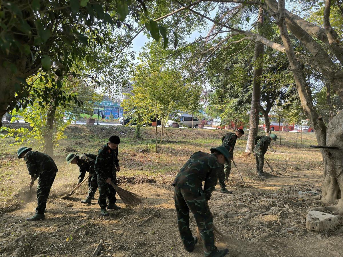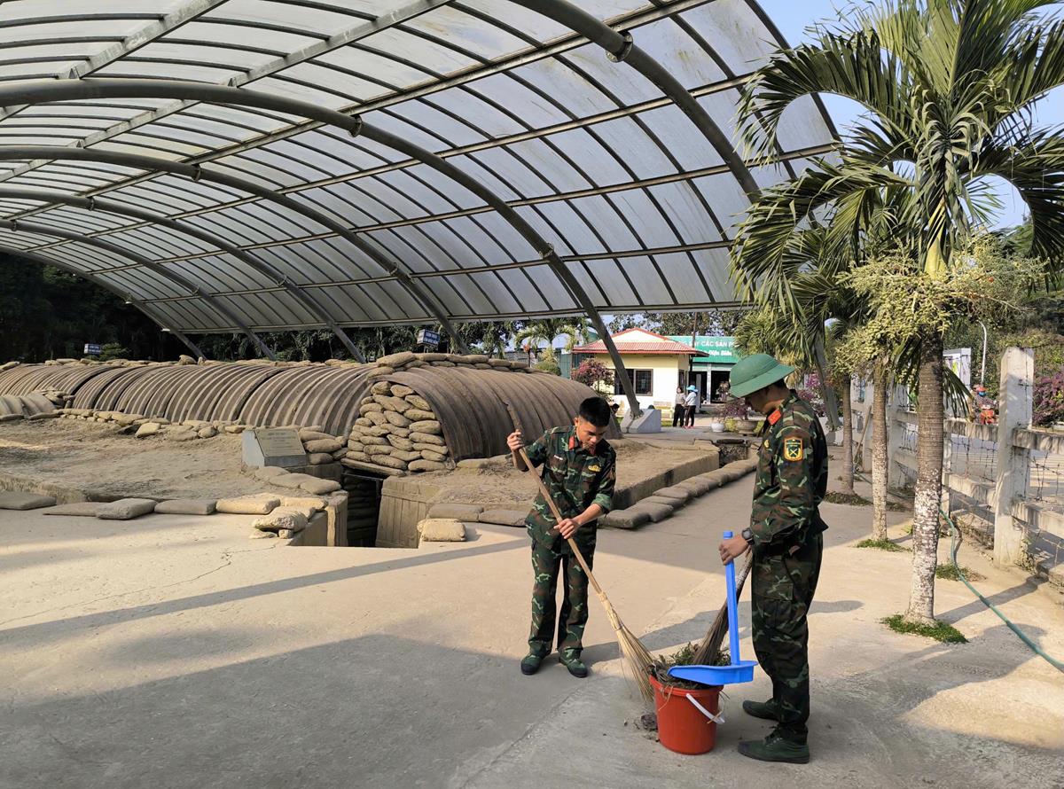 Các chiến sĩ tham gia quét dọn tại điểm di tích Trung tâm tập đoàn cứ điểm Điện Biên Phủ (Hầm Đờ Cát)