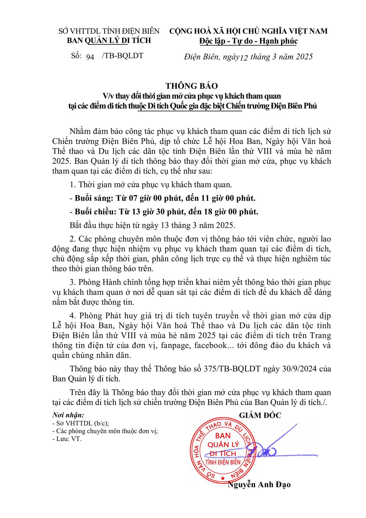 THÔNG BÁO V/v thay đổi thời gian mở cửa phục vụ khách tham quan tại các điểm di tích thuộc Di tích Quốc gia đặc biệt Chiến trường Điện Biên Phủ