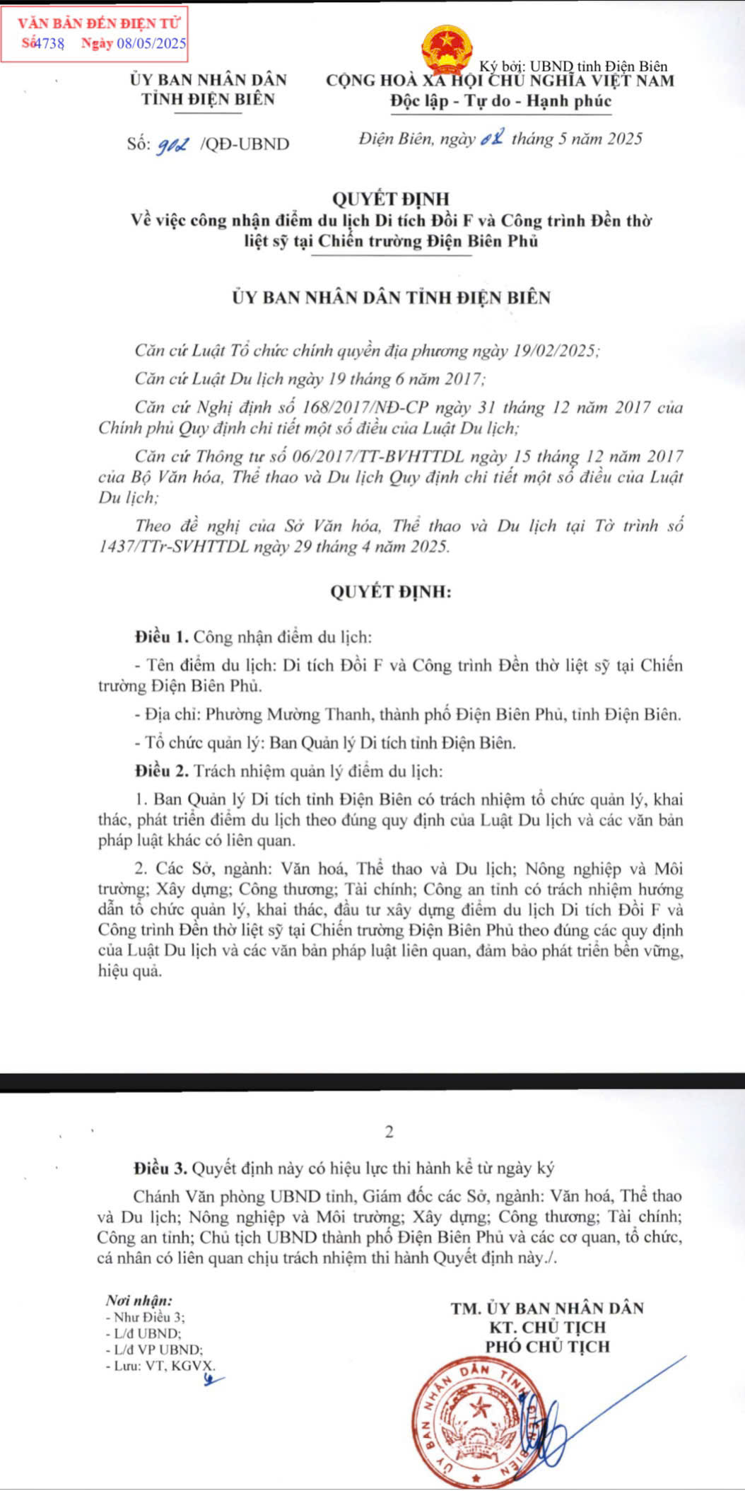 Quyết định của UBND tỉnh Điện Biên về việc công nhận điểm du lịch Di tích Đồi F và Công trình Đền thờ liệt sỹ tại Chiến trường Điện Biên Phủ