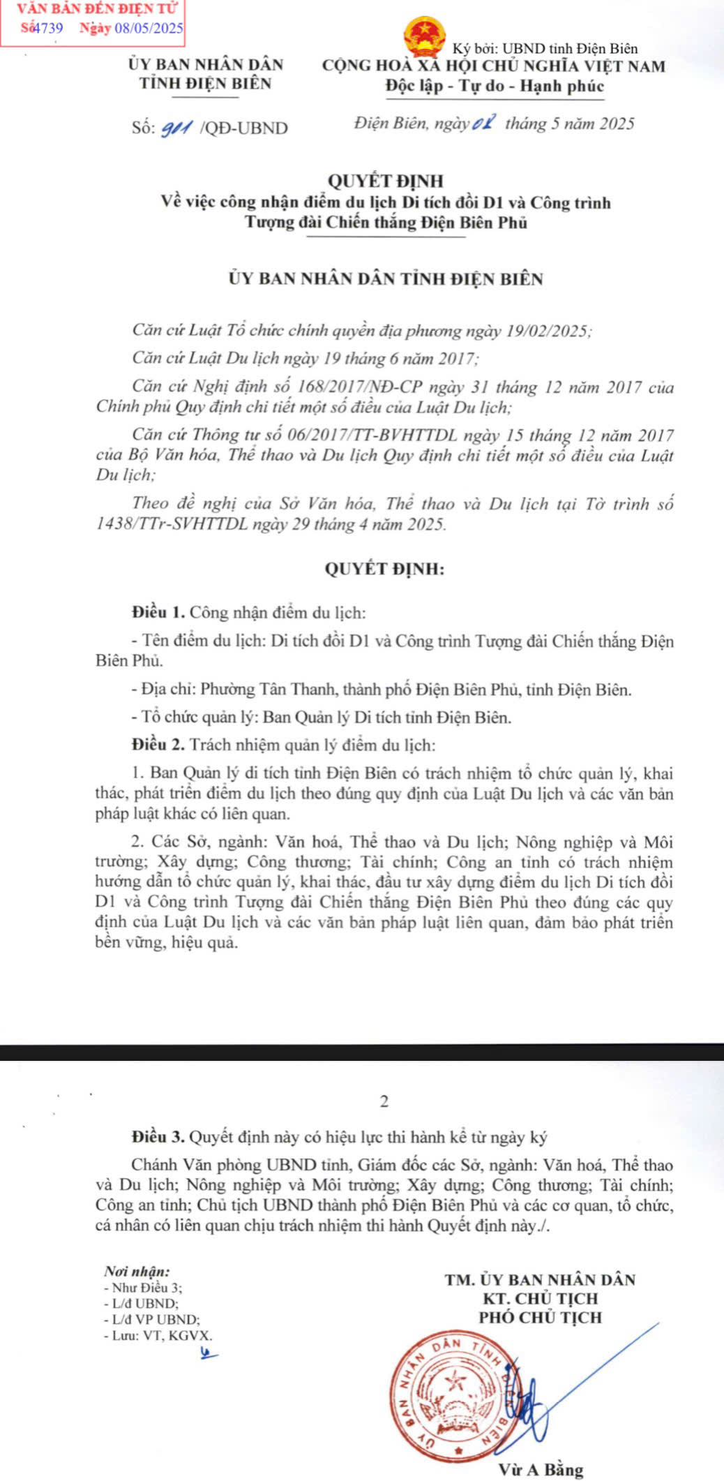 Quyết định của UBND tỉnh Điện Biên về việc công nhận điểm du lịch Di tích Đồi D1 và Công trình Tượng đài Chiến thắng Điện Biên Phủ