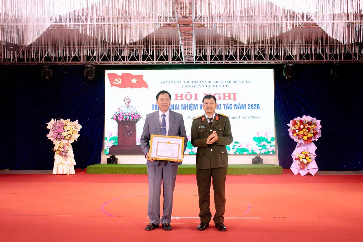 Đồng chí Nguyễn Anh Đạo - Bí thư Chi bộ, Giám đốc Ban Quản lý di tích nhận Giấy khen của Giám đốc Công an tỉnh Điện Biên trong tổ chức các hoạt động và phong trào thi đua kỷ niệm 80 năm Ngày truyền thống CAND...